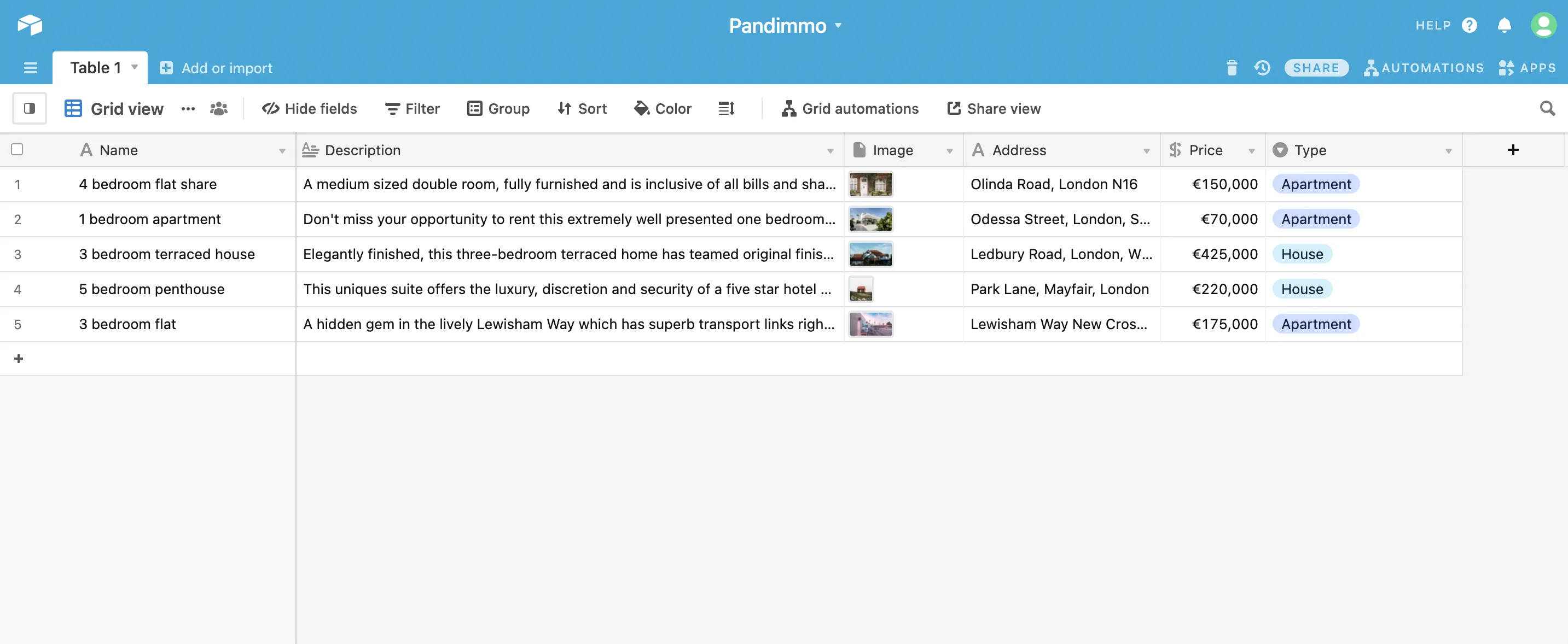 Build your database: add fields (Name, Price, Description, Image…) and fill in the corresponding data.