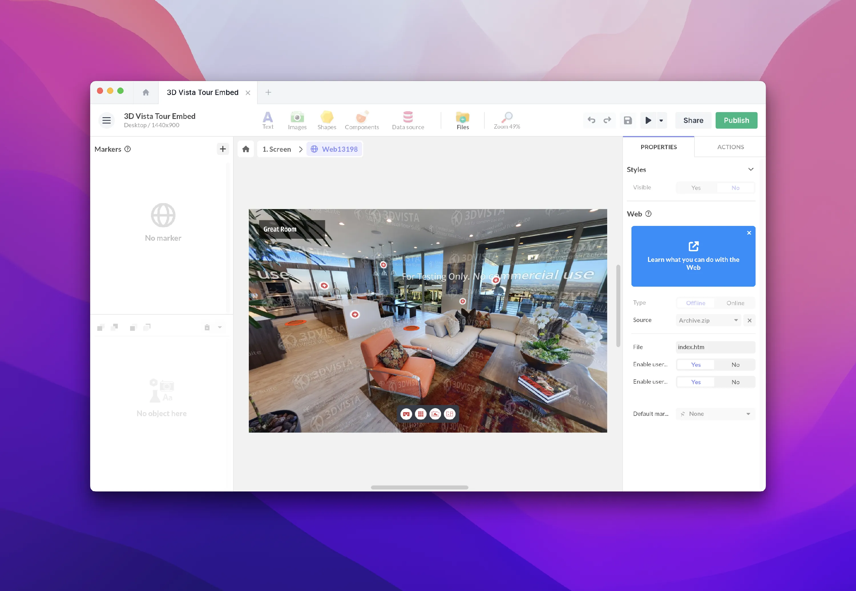This allows you to include multiple virtual tours, customized navigation, quizzes, and other interactive content created on-demand without any coding.