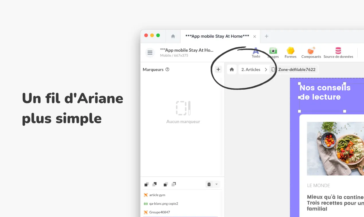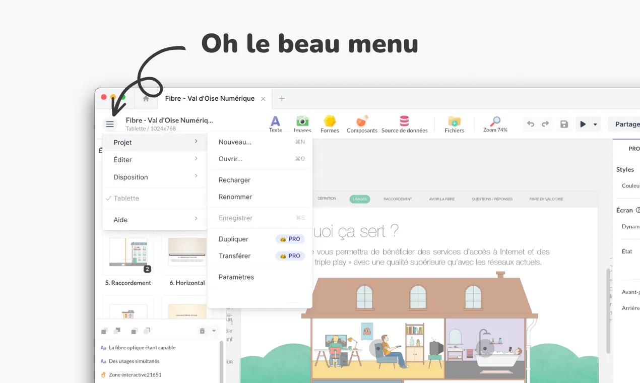 Après moultes réflexions et feedbacks, nous avons supprimé les onglets pour considérer le projet comme racine du fil d’Ariane. C’est au niveau du projet qu’on accède aux avant-plans, arrière-plans et écrans.